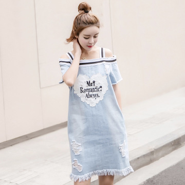 韓版bf風(fēng)寬松顯瘦磨破流蘇短袖牛仔裙一字領(lǐng)露肩吊帶連衣裙 /