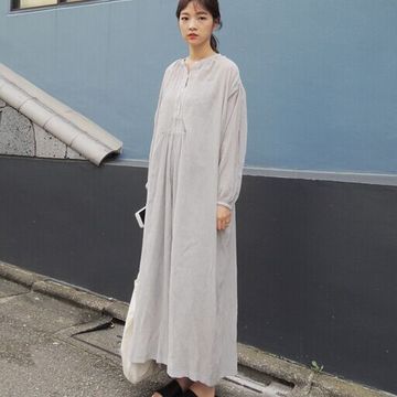 韓國NEW ARRIVAL 復(fù)古中式領(lǐng)寬松長款連衣裙 /