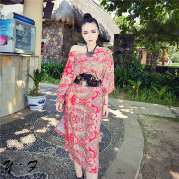 優(yōu)雅民族風(fēng)V領(lǐng)側(cè)開叉性感印花連衣裙+復(fù)古桃花腰封套裝 /