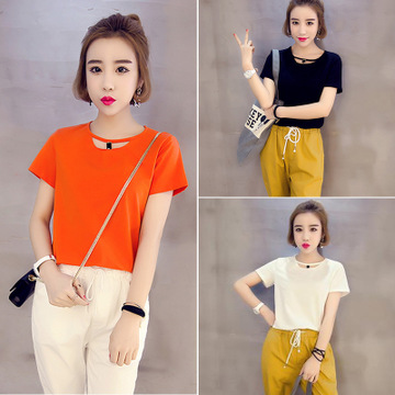 夏裝新款韓版鏤空圓領短袖t恤女套頭修身顯瘦百搭純色上衣潮 /
