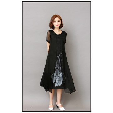新款夏季大碼女裝短袖假兩件套拼接亞麻印花真絲連衣裙女 /