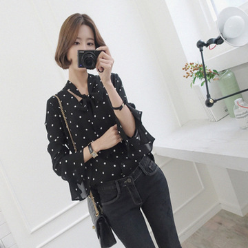一件代發(fā)早秋裝新款休閑百搭款圓點(diǎn)喇叭袖系帶襯衫 915 /