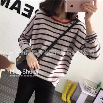 春秋新款 女士薄款 圓領紅色條紋針織套頭毛衣 寬松版 /