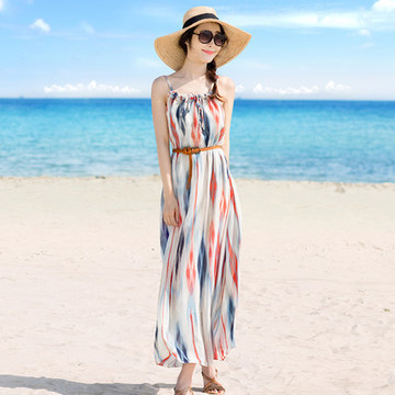 夏波西米亞吊帶連衣裙雪紡印花韓版長裙顯瘦海邊度假沙灘裙 /