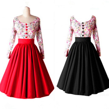 ebay亞馬遜爆款復(fù)古赫本風(fēng)50s印花長(zhǎng)袖收腰大擺裙連衣裙 /