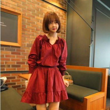 夏季新品酒紅色松緊裙復(fù)古文藝立領(lǐng)OL范連衣裙滌綸裙子 /