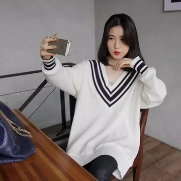 秋冬新款V領(lǐng)毛衣女寬松棒球純棉線羅紋毛衣學(xué)院風(fēng)針織線衣 /