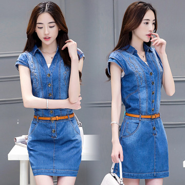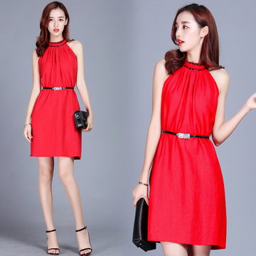 年夏季新款潮流韓版圓領修身顯瘦連衣裙純色中長款裙子 /