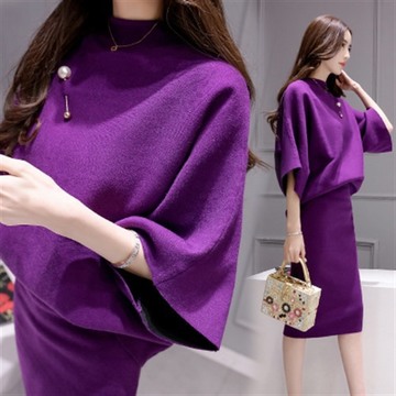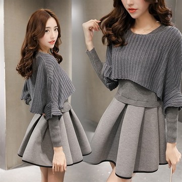 秋季新品時(shí)尚兩件套中長(zhǎng)款針織純色甜美圓領(lǐng)A字打底裙裙套裝 /
