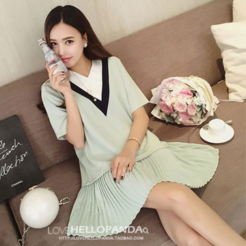 宋慧喬同款韓版夏季撞色拼接V領(lǐng)短袖百褶邊大碼連衣裙 /