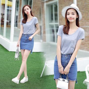 天天特價(jià)韓版性感V領(lǐng)百搭修身T恤時(shí)尚休閑顯瘦牛仔短裙 /