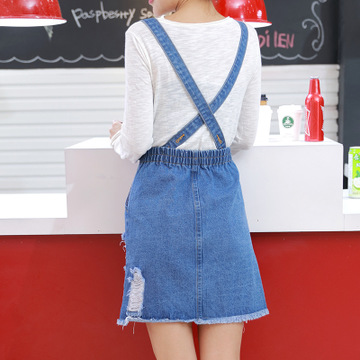 韓版春夏新款star高腰不規(guī)則破洞流蘇牛仔背帶半身裙女 潮 /