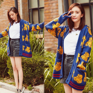楊冪微博街拍明星同款卡通小熊圖案長袖衫針織毛衣開衫女大量現(xiàn)貨 /