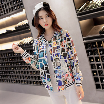 秋季新款女裝韓版修身百搭印花拼接棒球服夾克薄短外套批發(fā) /