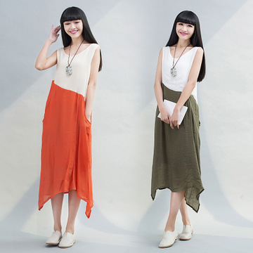 新款棉麻拼接民族風長款文藝復(fù)古寬松連衣裙女裝長裙 /
