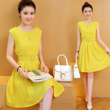 歐洲站無袖圓領(lǐng)棉麻連衣裙女中長款夏韓版顯瘦黃色百褶裙 /