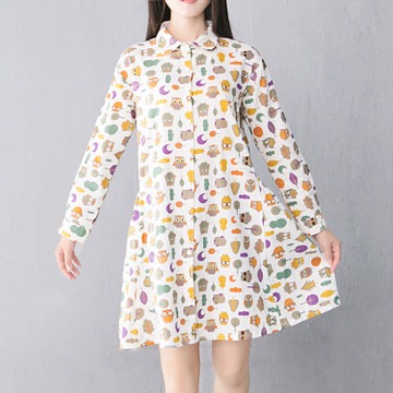 年文藝大碼寬松顯瘦襯衫裙棉麻月亮貓頭鷹連衣裙 /
