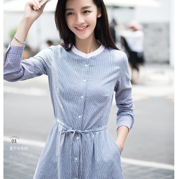 長袖襯衫連衣裙女韓版秋季新款女裝條紋中長款裙子寬松 /