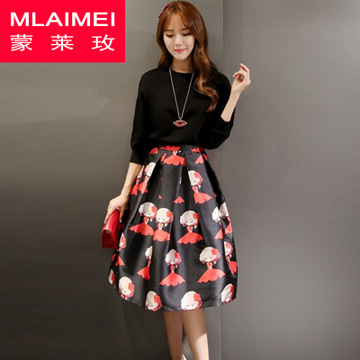 蒙萊玫春秋新款時尚圓領長袖氣質印花淑女氣質高腰兩件套女潮 /