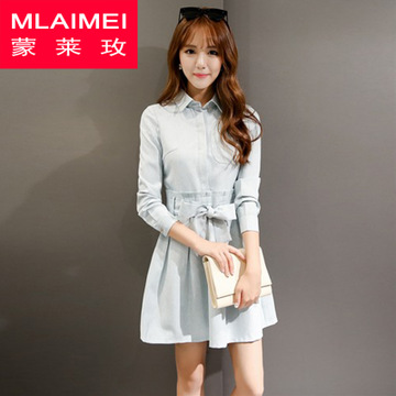 蒙萊玫春秋新款韓版時尚秋季翻領系帶長袖純色顯瘦修身連衣裙 /