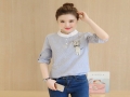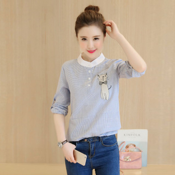 秋裝韓版寬松卡通刺繡條紋長袖立領(lǐng)打底衫學(xué)院風(fēng)繡花襯衫學(xué)生上衣 /