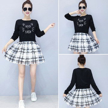歐洲站秋裝新款女裝紗網(wǎng)格紋小貓修身顯瘦印花假兩件連衣裙 /
