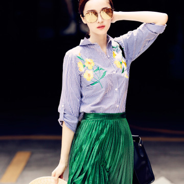 秋季明星高圓圓同款韓版休閑寬松藍(lán)色條紋花朵刺繡長袖襯衫女 /