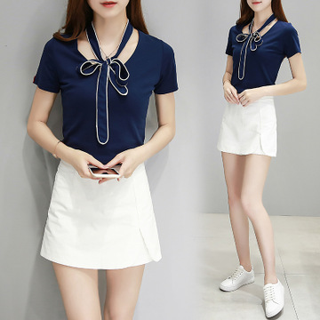 新款套裝女夏季韓版氣質(zhì)時(shí)尚新款蝴蝶結(jié)系帶上衣+裙褲兩件套 /