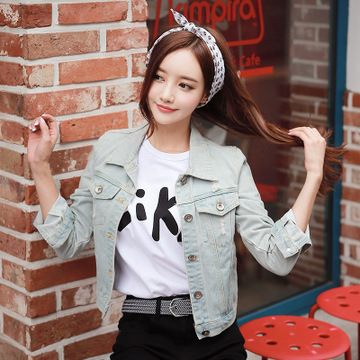 牛仔外套女秋款洗水長袖牛仔衣時(shí)尚百搭修身破洞短款牛仔外套 /
