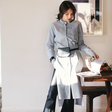 韓國(guó)秋裝新款 個(gè)性開(kāi)叉翻領(lǐng)純色長(zhǎng)款長(zhǎng)袖襯衫兩色 /