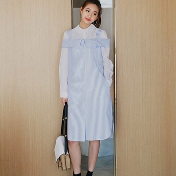 韓國(guó)秋裝新款 小清新條紋寬松假兩件襯衣連衣裙 /