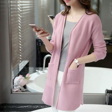 針織中長款寬松口袋V領韓版新款秋裝針織衫開衫毛衣女外套 /