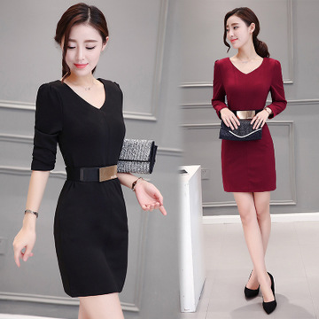 秋季新款韓版女裝修身V領長袖包臀大碼中長款時尚純色連衣裙 /