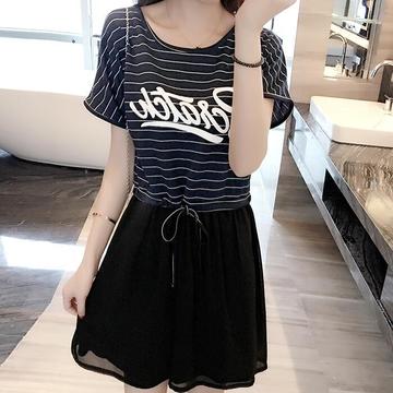 新款韓版大碼女裝 加肥加大胖mm顯瘦條紋印花時(shí)尚寬松系帶連衣裙 /