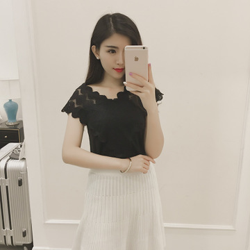 女裝新款夏季蕾絲拼接V領短袖修身顯瘦雪紡上衣 /