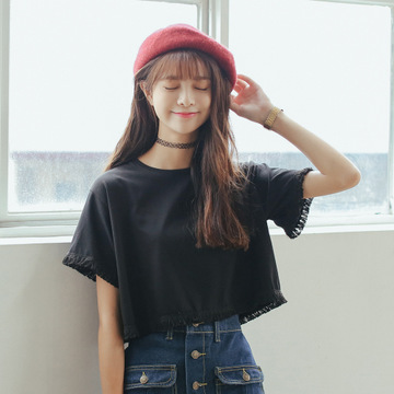 韓國訂單甜美純色百搭小短款寬松流蘇袖子邊邊基礎款個性T恤 /