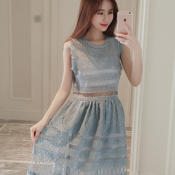 韓版圓領修身蕾絲無袖連衣裙中長款高腰鏤空裙子 /