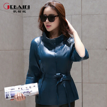 歌栢妮秋冬新款綿羊皮真皮皮衣女短款單皮系帶立領(lǐng)七分袖外套 /