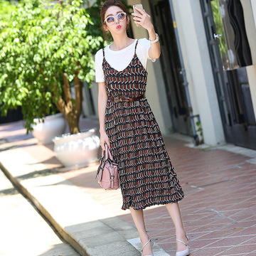 淘寶女裝一件代發(fā)雪紡吊帶印花 連衣裙海邊度假碎花沙灘百褶裙 /