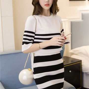 連衣裙夏裝新款女裝短袖針織衫修身長裙套裝裙兩件套 /