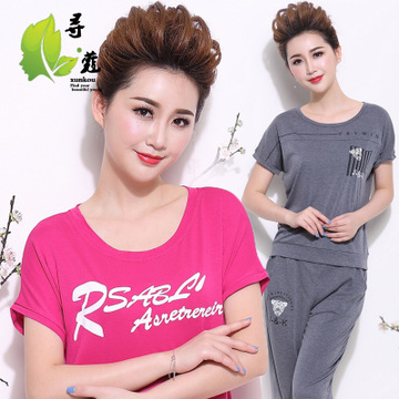 中年短袖運(yùn)動(dòng)套裝休閑寬松媽媽裝兩件套30-40歲印花T恤+九分褲女 /