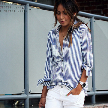 歐美性感休閑 寬松豎條紋長袖襯衫女裝1525 /