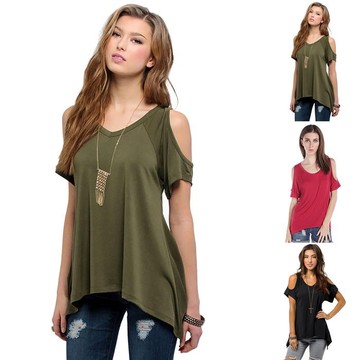 外貿(mào)爆款速賣通韓版女夏季短袖露肩V領(lǐng)純色棉質(zhì)魚(yú)尾下擺女T恤 /
