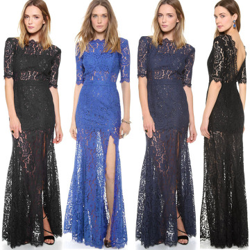 歐美外貿(mào)開叉蕾絲修身花邊性感包臀鏤空長袖連衣裙超長裙 禮服批 /