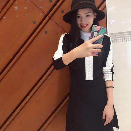 優(yōu)雅黑白拼接撞色鏤空針織長(zhǎng)袖連衣裙經(jīng)典修身顯瘦小黑裙 /