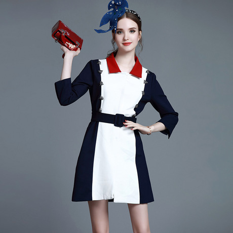女裝時(shí)尚拼色翻領(lǐng)虎頭扣子腰帶收腰英倫風(fēng)外套連衣裙 /