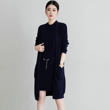 秋冬季新款兩件套修身羊毛開衫中長款套裝背心連衣裙打底針織衫女 /