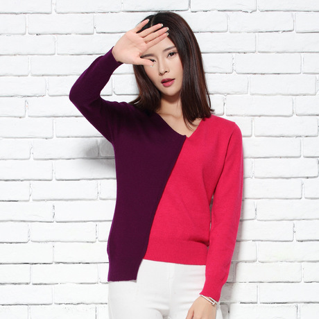 秋冬新品女式V領(lǐng)羊毛衫拼接撞色針織毛衣外套寬松學(xué)院風(fēng)薄款 /