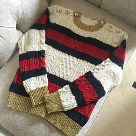 高級定制 秋冬新款女裝毛衣 意大利同步拼色條紋麻花金扣毛衣 /
