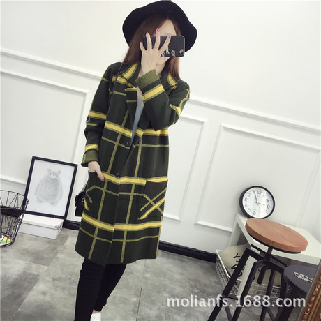 秋冬新款長款開衫毛衣韓版井字條紋單排扣針織衫外套 /